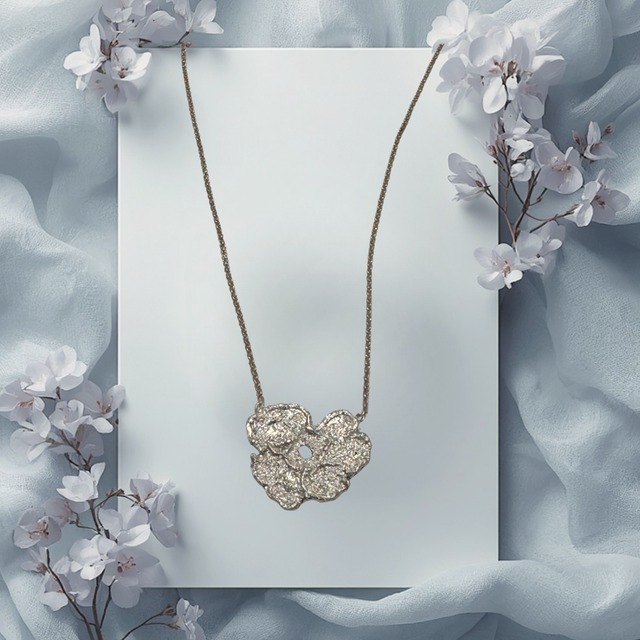 レースを金属に写し取る技法を用いた、 一点もののジュエリーシリーズです。 「糸の宝石」とも呼ばれるレースの繊細さと、 長い時間を経て育まれた手仕事の美しさを そのまま模様に起こしています。 レースをもとに形をつくっているため、金属でありながら 柔らかな表情が残り、細かな糸目や透かし模様まで 立体的に感じられます。 日常の装いにも自然に馴染み、 静かな華やかさを添えてくれます。 胡蝶蘭のような華やかさがあるレースを ネックレスにお仕立てしました。 黒のニットにこれ一つ、のような装いも素敵です 《仕様》 -------------------------- 素材:SV925(ナノコーティング付) サイズ:#14 《ナノコーティングとは》 ナノコティングは、植物由来の特殊コーティングです ナノレベルのコーティングは一度の加工で半年〜約1年効果を発揮し 金属本来の光沢を放ち、美しさを持続することができます。 《制作の背景》 レースシリーズは、光に透かしたレースがつくり出す 柔らかな影の美しさに心を奪われたことから生まれた ジュエリーです。 レースを通して光と影が布越しに静かに重なりあう様子を 手元で感じられるジュエリーにできないかと考えました。 糸で織られた柔らかな素材であるレースは 編み目を金属に写し取ることで 繊細な印象を保ちながら 身につけられるジュエリーへと姿を変えます。 鋳造の工程で布のレースは焼失するため、 どの作品も希少性の高い作品となっております。 日常に潜むやさしい光を、小さな物語として未来へつなぐ。 アンリガトウが大切にしているその想いを、 レースという手仕事の美しさを通して形にしたシリーズです。 《使用感について》 レースの透かし模様をそのまま生かしているため、 見た目にほどよい存在感がありながら、 重さを感じにくい軽やかなつけ心地です。 レースの凹凸がつくるやわらかなマット感が重なり、 装いに自然と馴染む、落ち着いた雰囲気に仕上がっています。 《注意点》 ・繊細な模様をそのまま写し取っているため、 強い力や衝撃にはご注意ください。 ・布地のアンティークレースをもとに形をつくっているため、 模様の大きさや表情には、わずかな揺らぎが生まれます。 レースならではの風合いをお楽しみください
